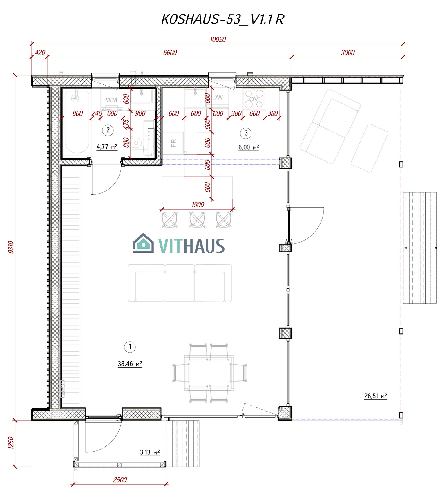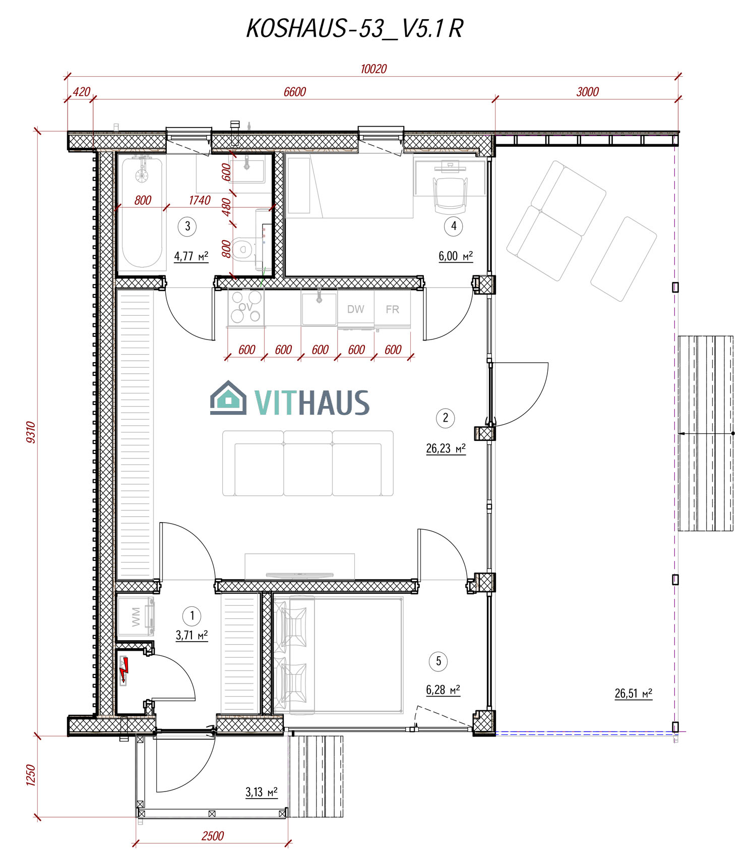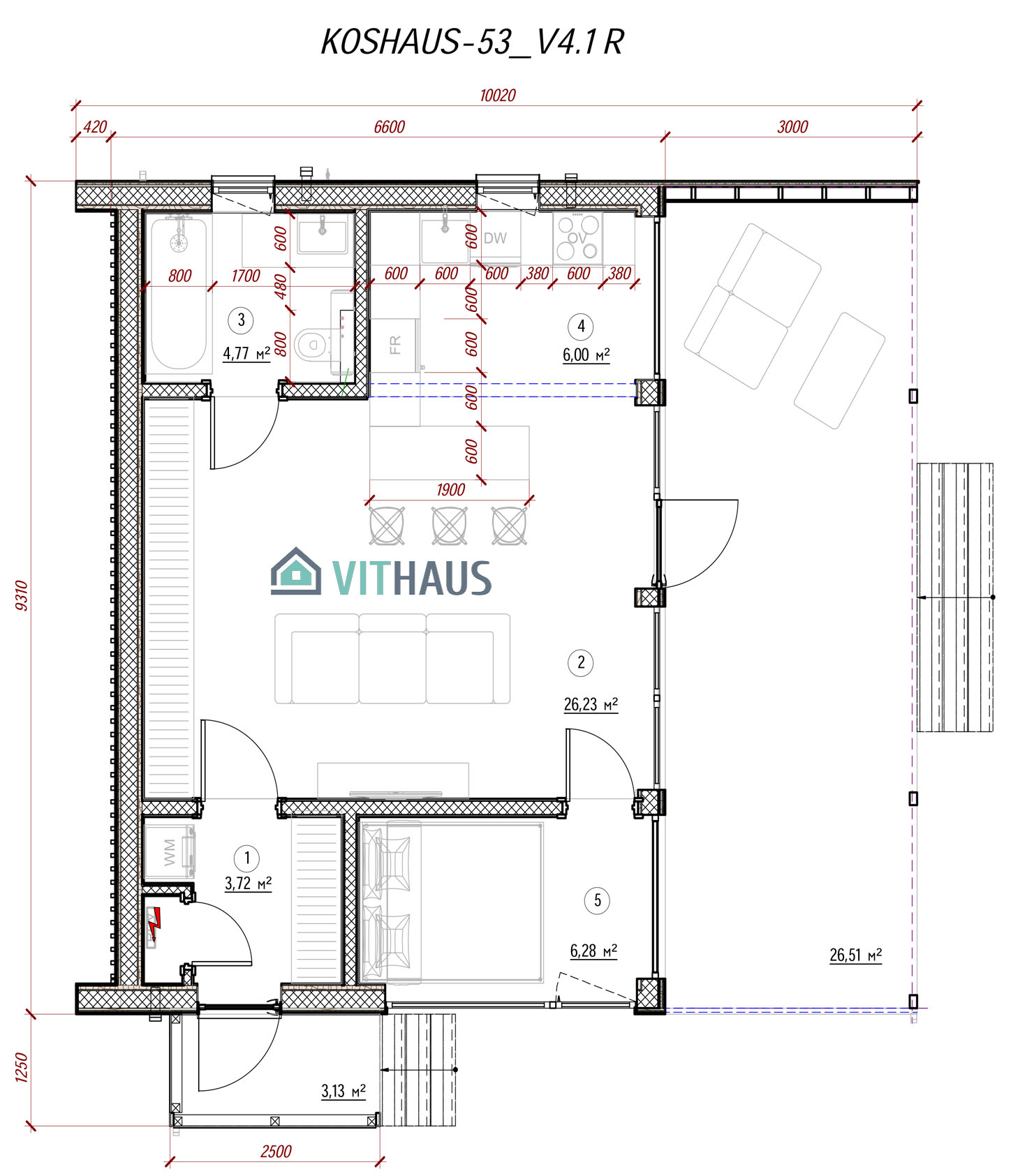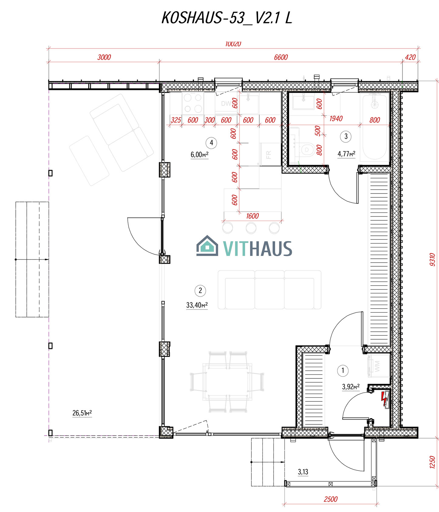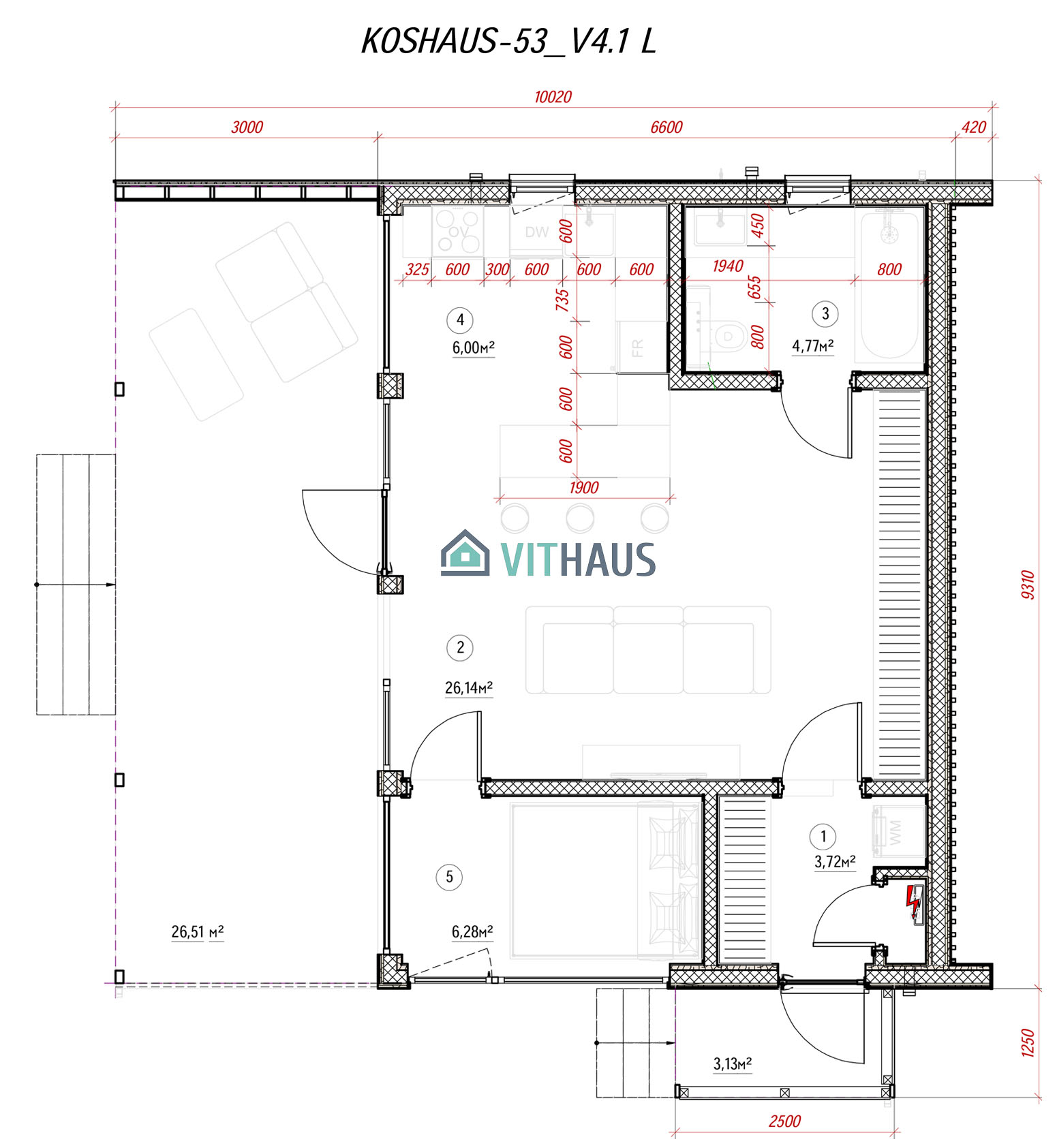 KOSHAUS-53 verfügt über alles um ein komfortables Wohnen für eine Person oder ein Paar ohne Kinder, ob jung oder erwachsen, bietet. Das Haus hat ein Schlafzimmer, Vorraum, Bad, Wohnraum mit einer Küche und einen kompakt integrierten, frei flächigen Essbereich sowie TV,- Kamin- und Abstellzone. Zukünftig kann das Haus in der Länge vergrößert werden, indem zusätzlich Schlafzimmer, Büros, Sauna, Sanitärräume und Räume für verschiede Zwecke angebaut werden. Dieses Model kann auch in zwei Etagen usgeführt werden.