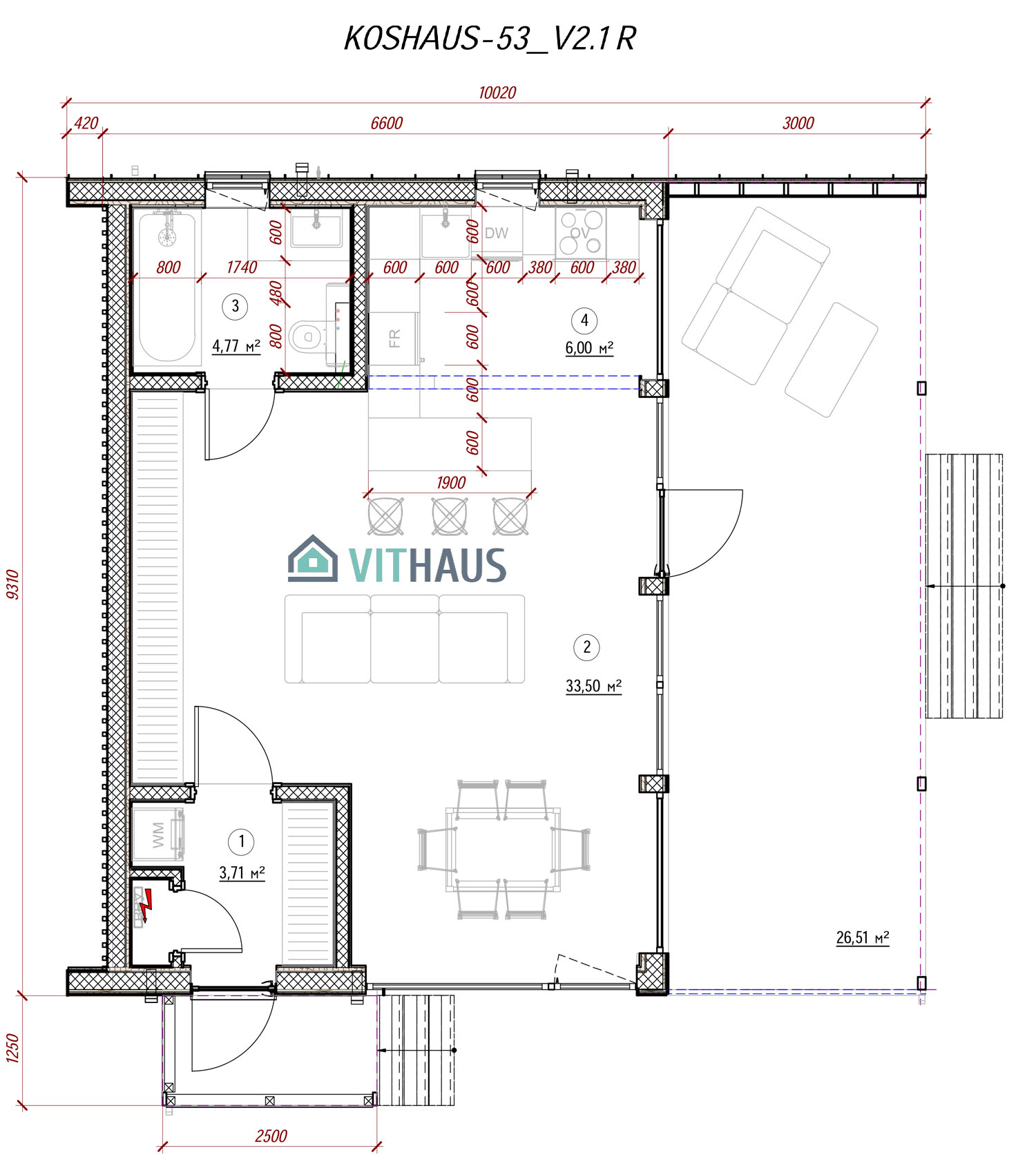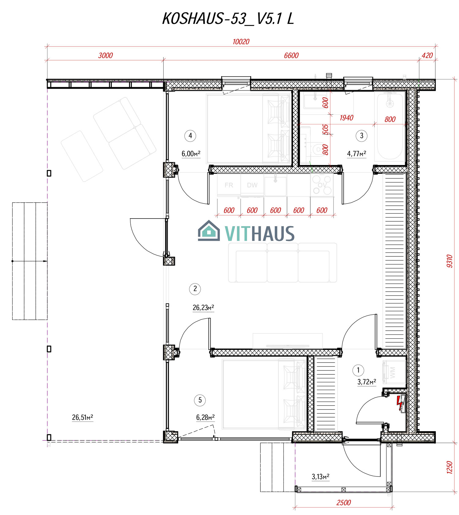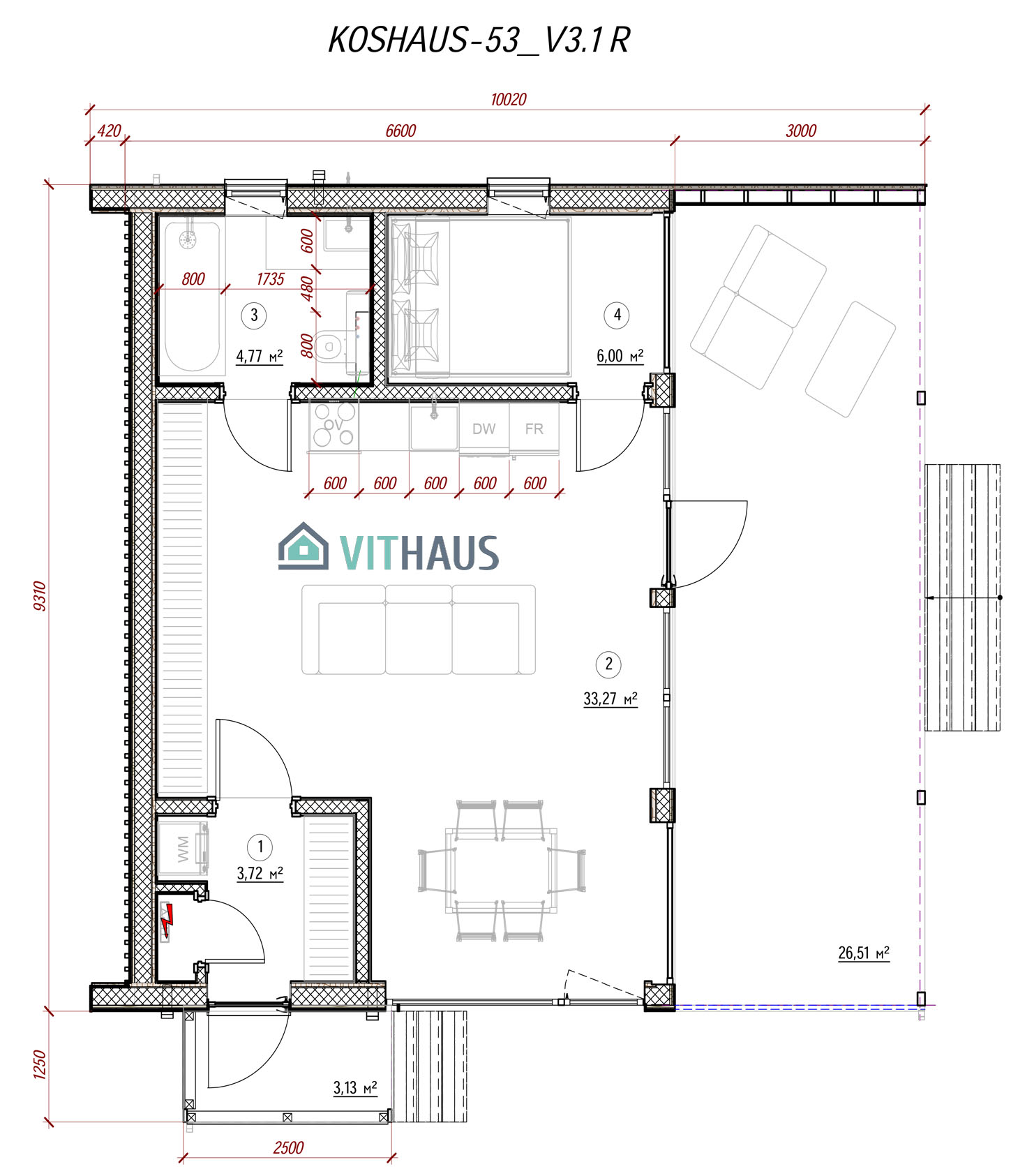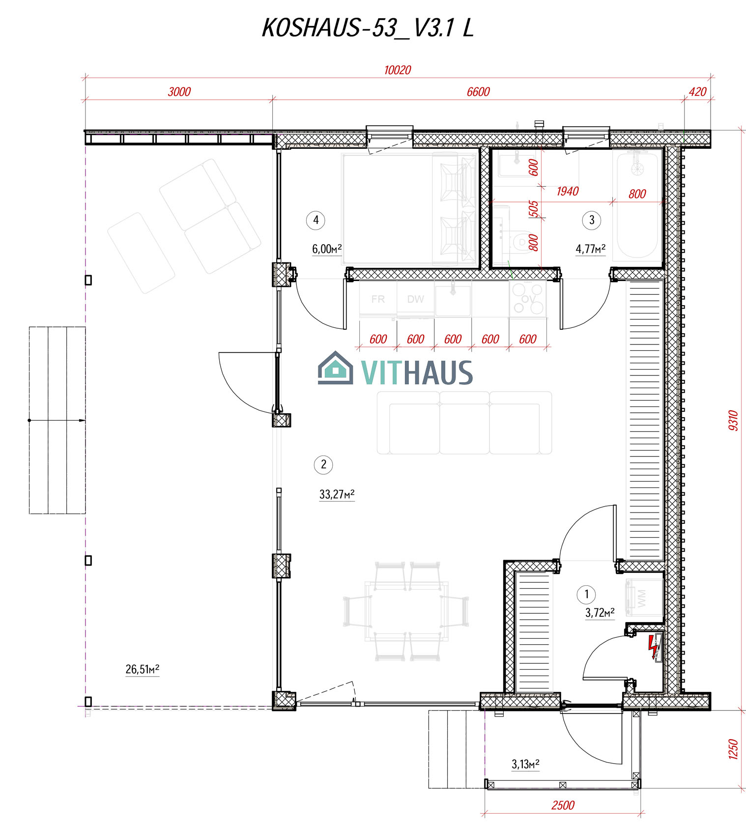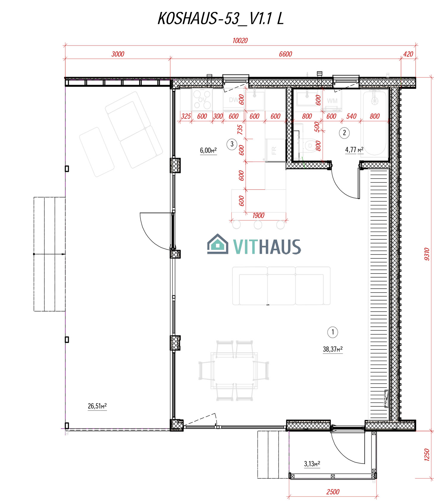 KOSHAUS-53 verfügt über alles um ein komfortables Wohnen für eine Person oder ein Paar ohne Kinder, ob jung oder erwachsen, bietet. Das Haus hat ein Schlafzimmer, Vorraum, Bad, Wohnraum mit einer Küche und einen kompakt integrierten, frei flächigen Essbereich sowie TV,- Kamin- und Abstellzone. Zukünftig kann das Haus in der Länge vergrößert werden, indem zusätzlich Schlafzimmer, Büros, Sauna, Sanitärräume und Räume für verschiede Zwecke angebaut werden. Dieses Model kann auch in zwei Etagen usgeführt werden.