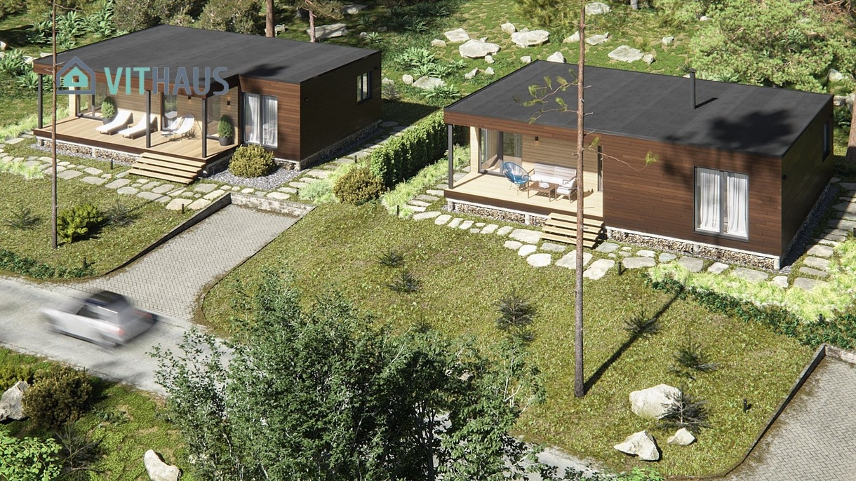 КУБХАУС-93 имеет 2 спальные комнаты, кухню-гостиную, санузел, кладовку, тамбур, террасу. При необходимости дом можно будет легко достроить вверх или в стороны. Два выхода из дома позволяют использовать жилое пространство по максимуму.